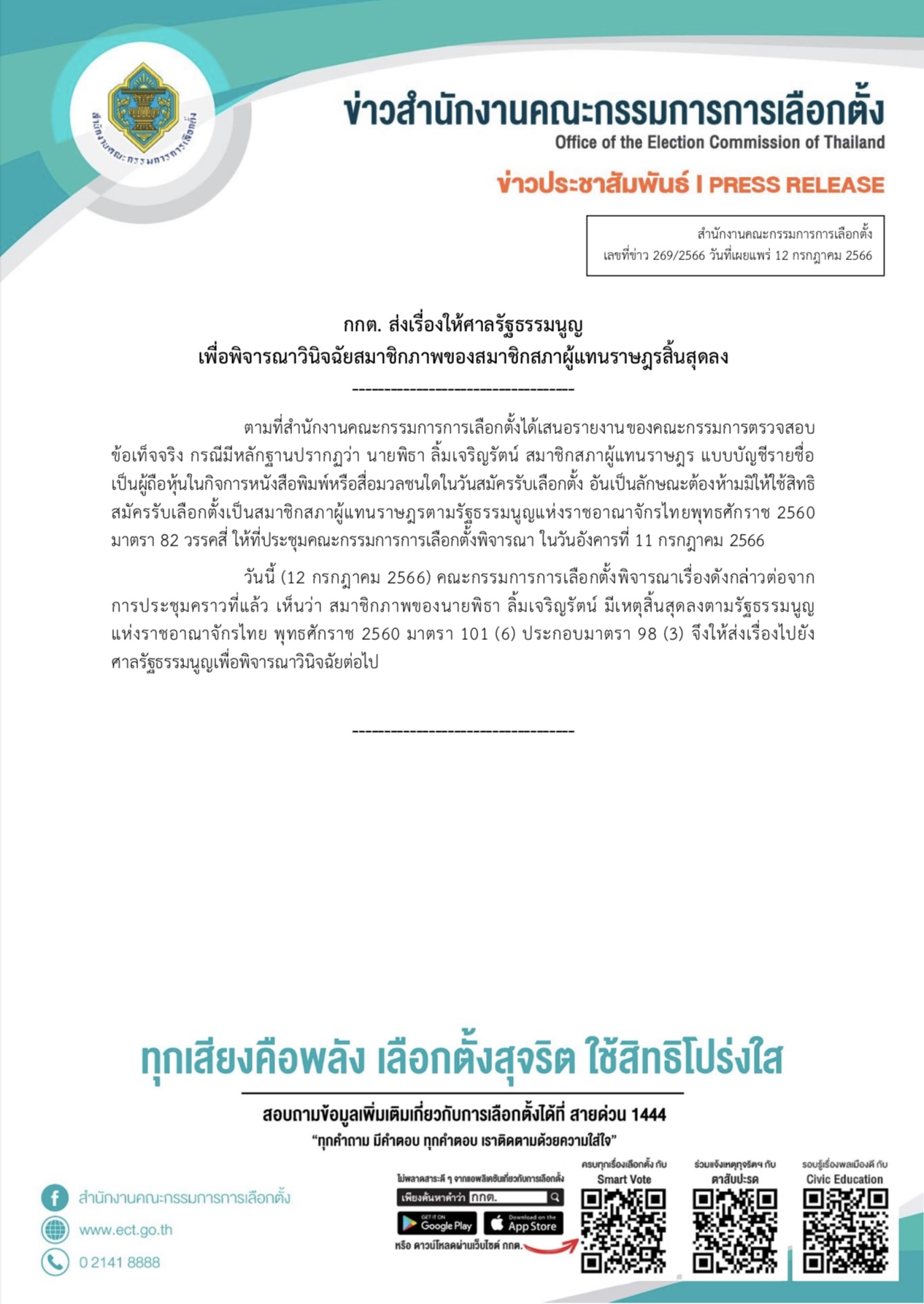 วันที่ 12 กรกฎาคม 2566 ผู้สื่อข่าวรายงานจากศาลรัฐธรรมนูญ ว่า ร.ต.อ.ชนินทร์ น้อยเล็ก และ พ.ต.ต.ณัฐวัฒน์ เสงี่ยมศักดิ์ รองเลขาธิการคณะกรรมการการเลือกตั้ง (กกต.) พร้อมเจ้าหน้าที่ กกต. นำคำร้องพร้อมแฟ้มหลักฐานจำนวน 3 กล่อง มายื่นต่อศาลรัฐธรรมนูญ ตามมติของ กกต. ที่มีมติขอให้ศาลรัฐธรรมนูญวินิจฉัยคุณสมบัติ นายพิธา ลิ้มเจริญรัตน์ ส.ส.บัญชีรายชื่อ และแคนดิเดตนายกรัฐมนตรี พรรคก้าวไกล กรณีถือครองหุ้นไอทีวี 42,000 หุ้น ตามมาตรา 82 วรรค 4 ที่ห้าม ส.ส.ถือครองหุ้นสื่อ ซึ่งจะมีผลให้จากสมาชิกภาพ ส.ส. ตามรัฐธรรมนูญมาตรา 98 (3) ประกอบมาตรา 101 (6) หรือไม่