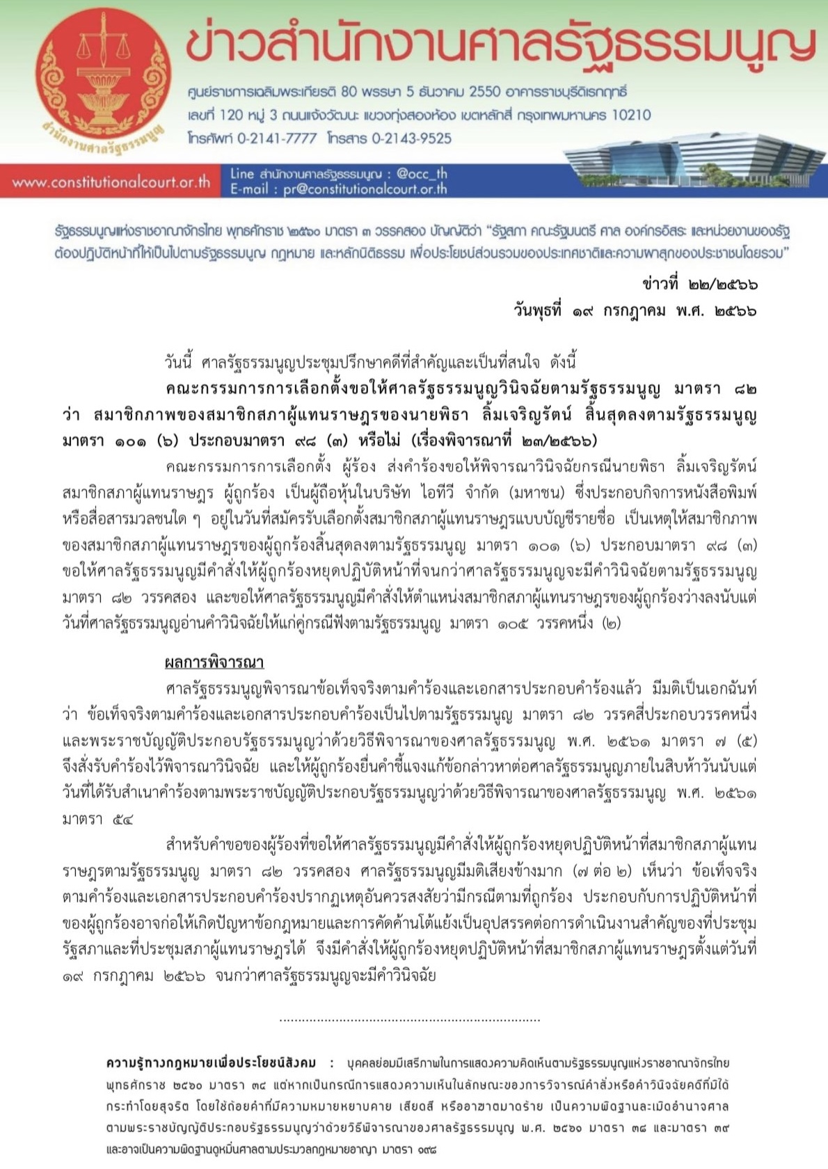 ในขณะที่ที่ประชุมรัฐสภากำลังถกเถียงกันว่าจะโหวตนายพิธา เป็นนายกฯ อีกครั้งได้หรือไม่ คณะตุลาการศาลรัฐธรรมนูญได้พิจารณาคำร้องที่คณะกรรมการการเลือกตั้ง (กกต.) ขอให้ศาลรัฐธรรมนูญวินิจฉัย ตามรัฐธรรมนูญ มาตรา 82 ว่า สมาชิกภาพ ส.ส. ของนายพิธา ลิ้มเจริญรัตน์ สิ้นสุดลงตามรัฐธรรมนูญ มาตรา 101 (6) ประกอบมาตรา 98 (3) หรือไม่ จากปมถือหุ้น บมจ. ไอทีวี เมื่อเวลา 9.30 น. เช่นกัน