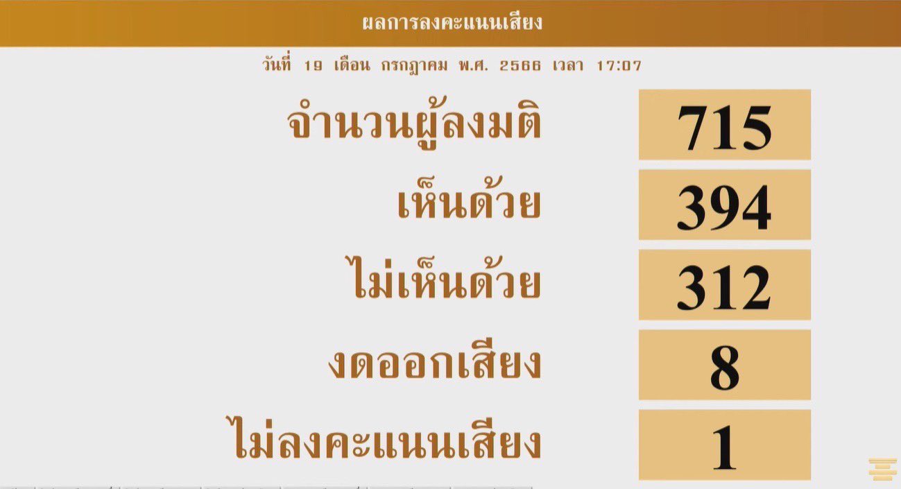 ที่ประชุมรัฐสภามีมติ 394 ต่อ 312 ว่า การเสนอชื่อนายพิธา ลิ้มเจริญรัตน์ "กระทำไม่ได้” เพราะเป็นการขัดข้อบังคับการประชุมรัฐสภา ข้อที่ 41 ทำให้ไม่สามารถเสนอชื่อนายพิธาให้สมาชิกรัฐสภาลงมติให้ความเห็นชอบบุคคลแต่งตั้งเป็นนายกรัฐมนตรี ตามรัฐธรรมนูญ มาตรา 272 ได้ในสมัยประชุมนี้ โดยมีสมาชิกงดออกเสียง 8 คน และไม่ลงคะแนน 1 คน