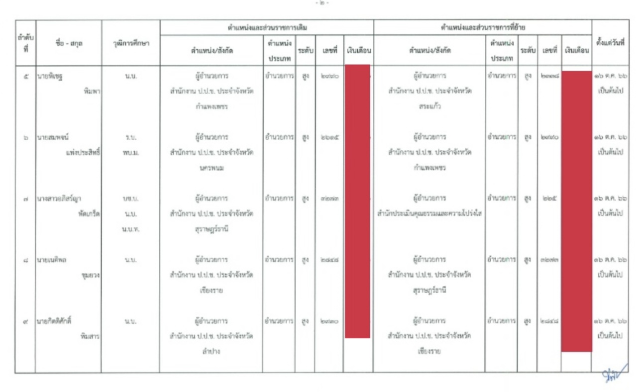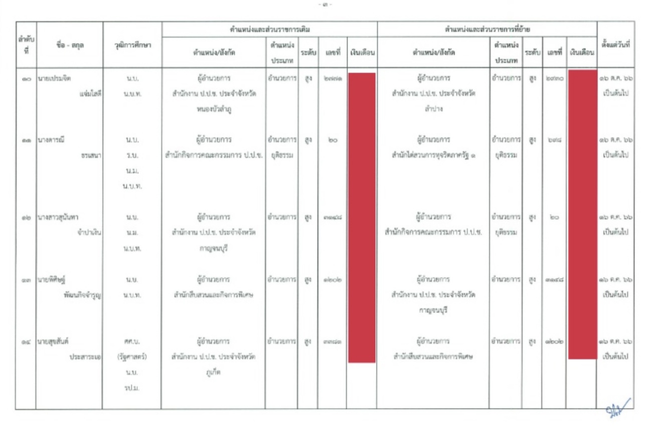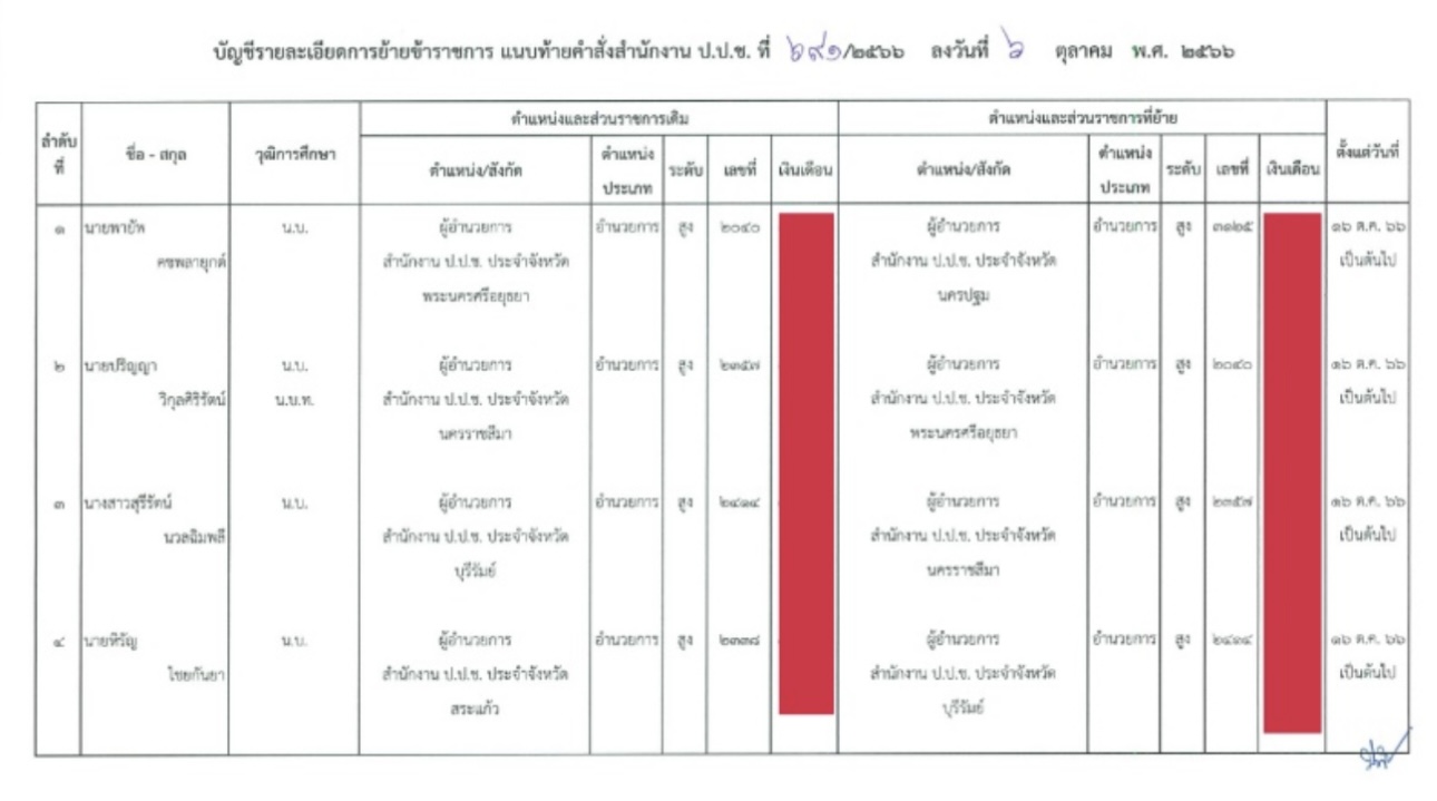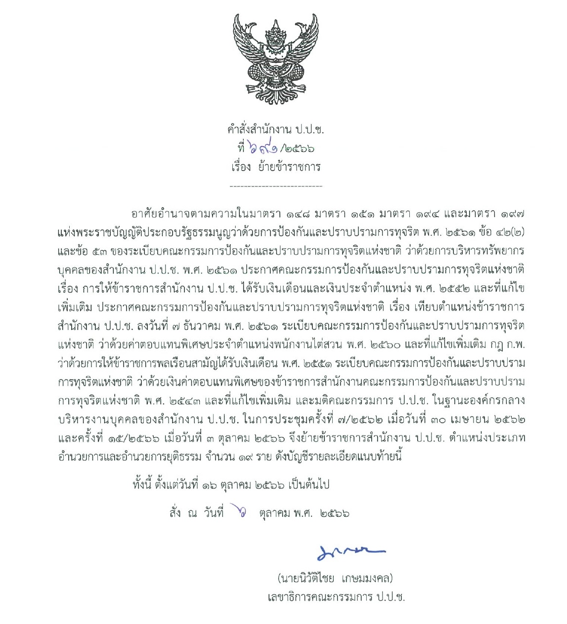 ‘นิวัติไชย เกษมมงคล’ เลขาฯ ป.ป.ช.ออกคำสั่งย้ายข้าราชการ ระดับ ผอ. 19 ราย รักษาราชการ 8 - ผู้อำนวยการพระนครศรีอยุธยา ไปอยู่นครปฐม -สำนักกิจการคณะกรรมการฯ ดูไต่สวนการทุจริตภาครัฐ 1 - เชียงราย ลงใต้ สุราษฎร์ธานี - ปทุมธานี มา นนทบุรี มีผล 16 ตุลาคม 2566