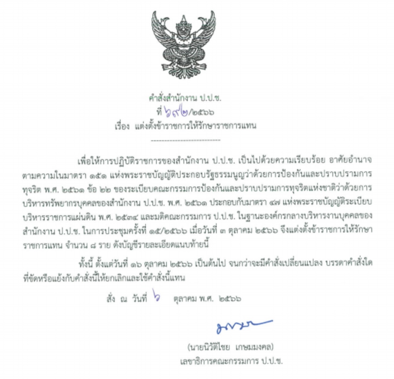คำสั่งแต่งตั้งข้าราชการให้รักษาราชการ จำนวน 8 ราย ตามคำสั่งสำนักงาน ป.ป.ช. ที่ 692/2566 ดังนี้