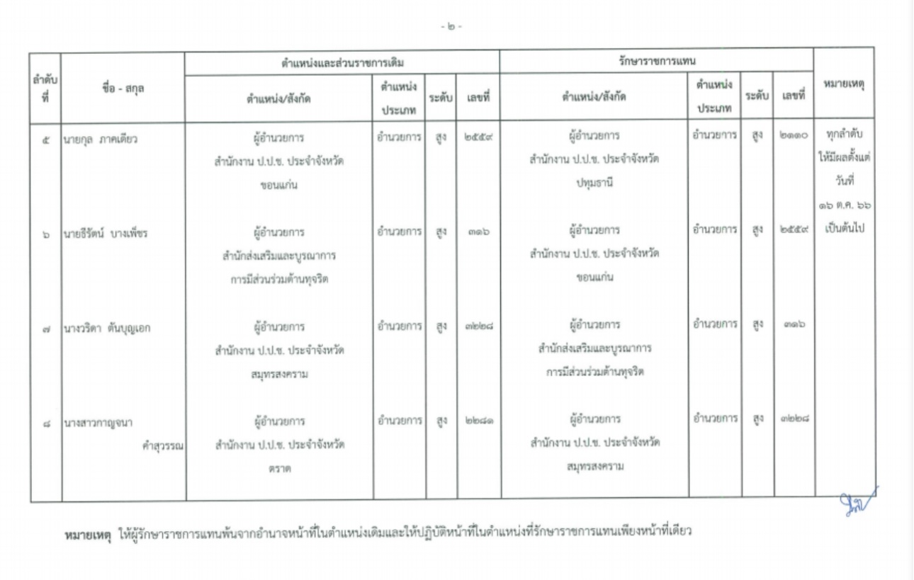 หมายเหตุ ให้ผู้รักษาราชการแทนพ้นจากอำนาจหน้าที่ในตำแหน่งเดิมและให้ปฎิบัติหน้าที่ในตำแหน่งที่รักษาราชการแทนเพียงหน้าที่เดียว