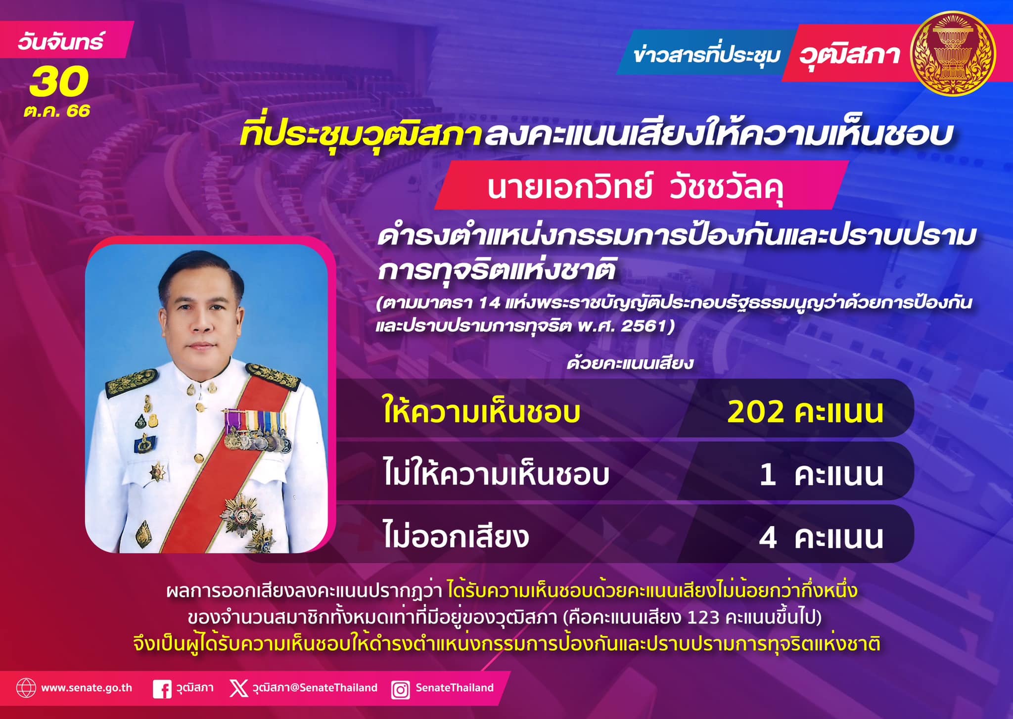 การประชุมวุฒิสภาวันนี้ (30 ตุลาคม 2566) นายพรเพชร วิชิตชลชัย ประธานวุฒิสภา เป็นประธานการประชุม ได้ประชุมลับพิจารณารายงานตรวจสอบประวัติและความประพฤติ ผู้ที่ได้รับการเสนอชื่อให้ดำรงตำแหน่งกรรมการป้องกันและปราบปรามการทุจริตแห่งชาติ (ป.ป.ช.) และมีมติให้ความเห็นชอบ นายเอกวิทย์ วัชชวัลคุ ผู้พิพากษาหัวหน้าคณะศาลฎีกา ผู้ได้รับการเสนอชื่อให้ดำรงตำแหน่งกรรมการป้องกันและปราบปรามการทุจริตแห่งชาติ (ตามมาตรา 14 แห่งพระราชบัญญัติประกอบรัฐธรรมนูญว่าด้วยการป้องกันและปราบปรามการทุจริต พ.ศ. 2561) ด้วยคะแนนเสียง ให้ความเห็นชอบ 202 คะแนน ไม่ให้ความเห็นชอบ 1 คะแนน ไม่ออกเสียง 4 คะแนน