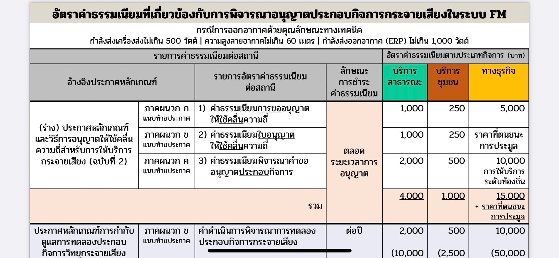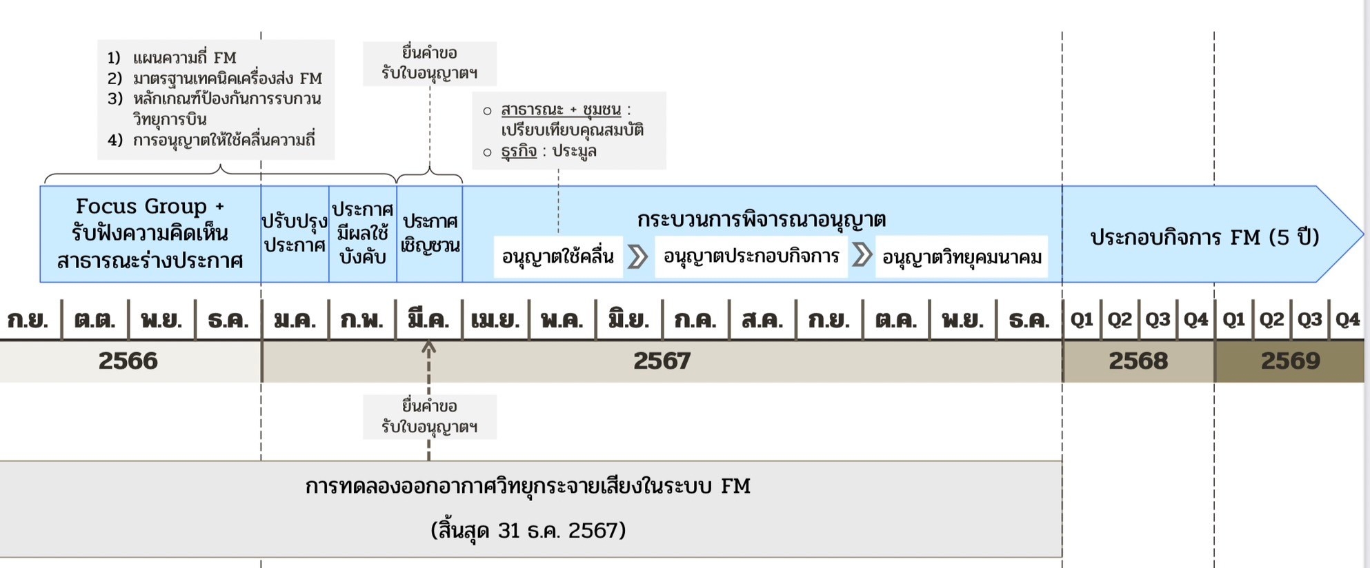 ตามที่ กสทช. ชุดที่แล้วได้มีมติให้สถานีวิทยุทดลองออกอากาศในระบบเอฟเอ็มทั้งในส่วนของกิจการประเภทชุมชน สาธารณะ และ ธุรกิจ ซึ่งปัจจุบันมีอยู่ประมาณ 3,902 สถานี (ชุมชน 159 สาธารณะ 611 และ ธุรกิจ 3,132 สถานี) ต้องยุติการทดลองออกอากาศหลังวันที่ 31 ธันวาคม 2567 ทำให้ กสทช.ชุดปัจจุบันได้พิจารณาแนวทางในการดำเนินการเพื่อให้ผู้ทดลองออกอากาศดังกล่าว ได้ออกอากาศต่อไปได้โดยได้รับการอนุญาตให้ใช้คลื่นความถี่และประกอบกิจการอย่างถูกต้องตามกฎหมายปราศจากการรบกวนซึ่งกันและกัน โดยที่ประชุม กสทช. ครั้งที่ 21/2566 เมื่อวันที่ 25 ตุลาคม 2566 ได้มีมติให้นำ (ร่าง) ประกาศฯ ดังกล่าวทั้ง 4 ฉบับ ไปรับฟังความคิดเห็นสาธารณะ โดยมีสาระสำคัญสรุป ดังนี้