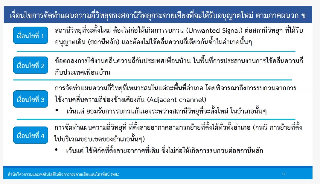 4. (ร่าง) ประกาศ กสทช. เรื่อง หลักเกณฑ์ป้องกันการรบกวนการใช้คลื่นความถี่ของสถานีวิทยุกระจายเสียงต่อกิจการวิทยุการบิน มีการเพิ่มเติมเงื่อนไขการกำกับดูแลตามหลักเกณฑ์ดังกล่าวเพื่อให้มีความสมบูรณ์และสะดวกต่อการปฏิบัติ เพื่อดำรงไว้ซึ่งความปลอดภัยทางด้านการบินของประเทศไทย