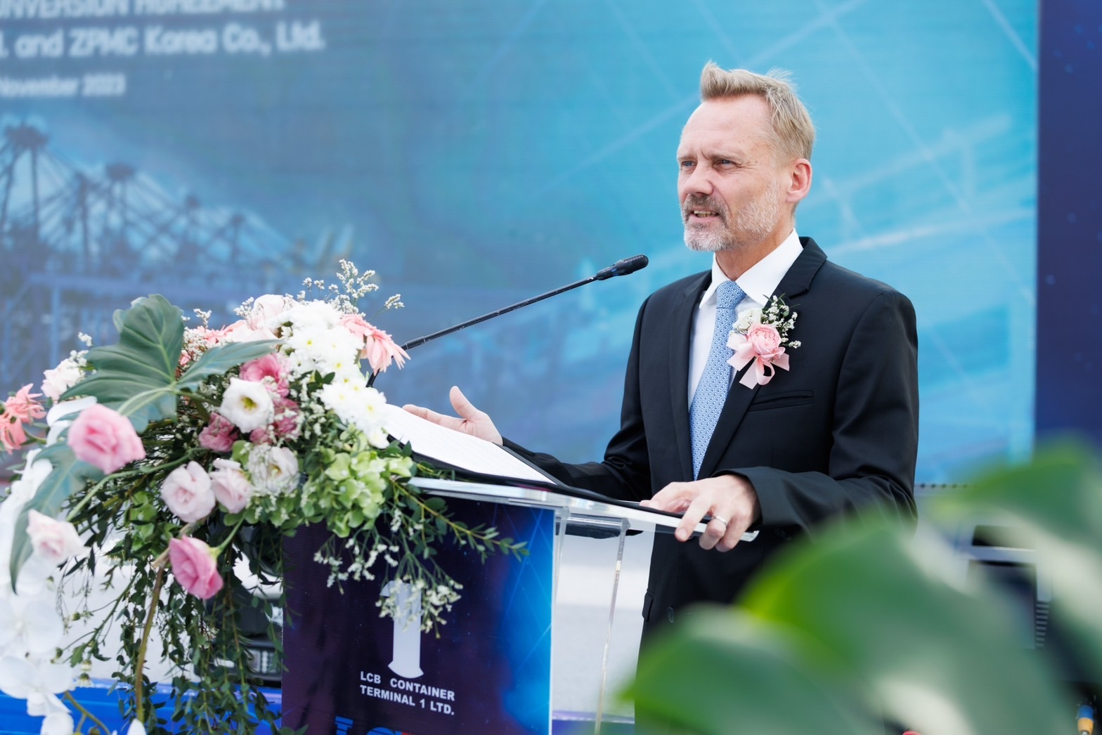 ด้านนายเกรียงไกร ไชยศิริวงศ์สุข ผู้อำนวยการการท่าเรือแห่งประเทศไทย กล่าวว่าในฐานะตัวแทนของการท่าเรือแห่งประเทศไทย ต้องขอขอบคุณกลุ่มบริษัท แอลซีบีวัน ผู้ประกอบการท่าเทียบเรือบี 1 และท่าเทียบเรือเอ 0 ที่ตลอดระยะเวลากว่า 28 ปีที่ผ่านมาได้ ร่วมมือกับการท่าเรือแห่งประเทศไทยในการส่งมอบบริการด้านโลจิสติกส์ให้กับเรือขนส่งสินค้า ระหว่างประเทศขนาดใหญ่ด้วยมาตรฐานท่าเทียบเรือระดับโลก ซึ่งทำให้สายเดินเรือระหว่าง ประเทศเชื่อมั่นและมั่นใจว่าประเทศไทยจะได้ให้บริการขนส่งตู้สินค้าได้รวดเร็ว ปลอดภัยและเป็น มาตรฐานสากล ความเชื่อมั่นดังกล่าวได้สะท้อนให้เห็นจากปริมาณตู้สินค้าผ่านท่าที่เข้ามาใช้บริการ ท่าเทียบเรือบี 1 และเอ 0 สูงถึงกว่า 1.7 ล้านทีอียูต่อปีหรือคิดเป็นประมาณร้อยละ 20 ของ ปริมาณตู้สินค้าคอนเทนเนอร์ทั้งหมดของประเทศ การจัดการสินค้าที่ดีทำให้เกิดเศรษฐกิจ หมุนเวียนทั้งภายในและภายนอกประเทศ และทำให้ฟันเฟืองของระบบโลจิสติกส์โลกหมุนไปได้ อย่างมีประสิทธิภาพ
