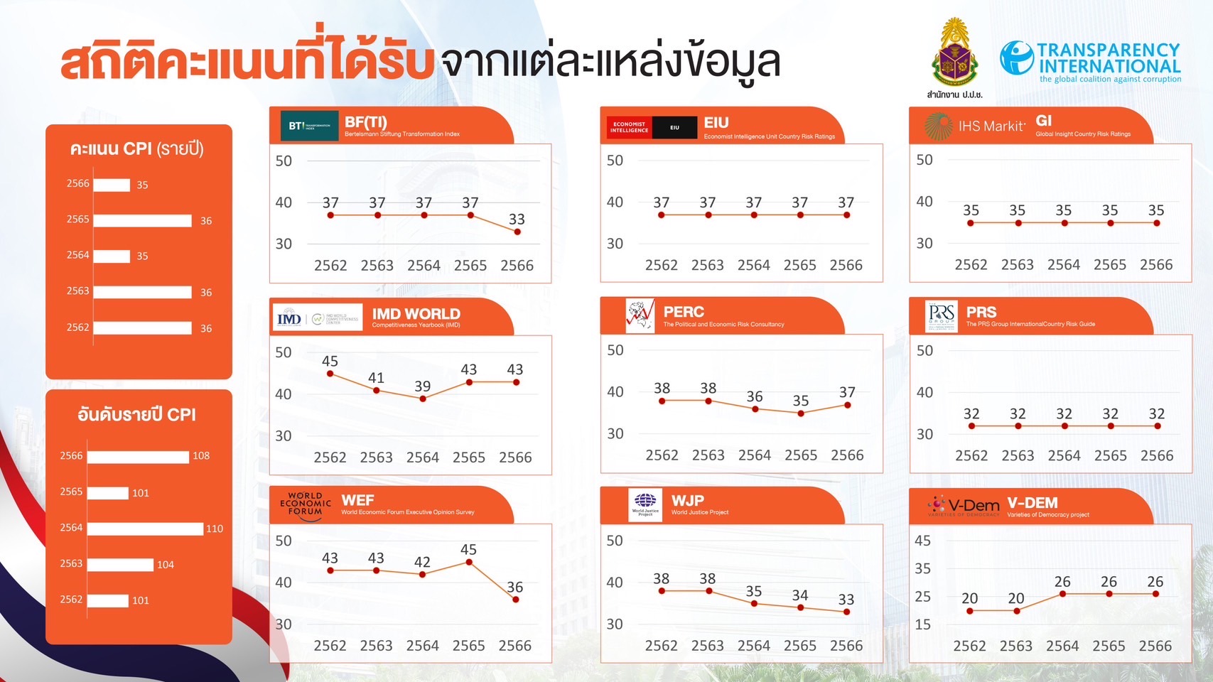 ป.ป.ช. เผยองค์กรเพื่อความโปร่งใสนานาชาติประกาศผลดัชนีการรับรู้การทุจริต (CPI) ประจำปี 2566 ประเทศไทย ได้ 35 คะแนน จัดอยู่ในอันดับที่ 108 ของโลก