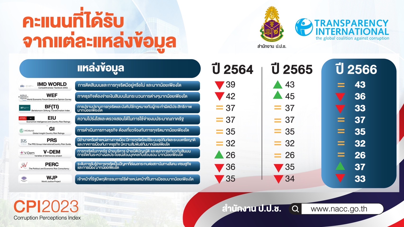 ลดลง 3 แหล่ง คือ BF(TI) ลดลงจาก 37 คะแนนในปี 2565 เป็น 33 คะแนน, WEF ลดลงจาก 45 คะแนนในปี 2565 เป็น 36 คะแนน, และ WJP ลดลงจาก 34 คะแนนในปี 2565 เป็น 33 คะแนน และคงที่ 5 แหล่ง คือ EIU, GI, IMD PRS และ V-DEM