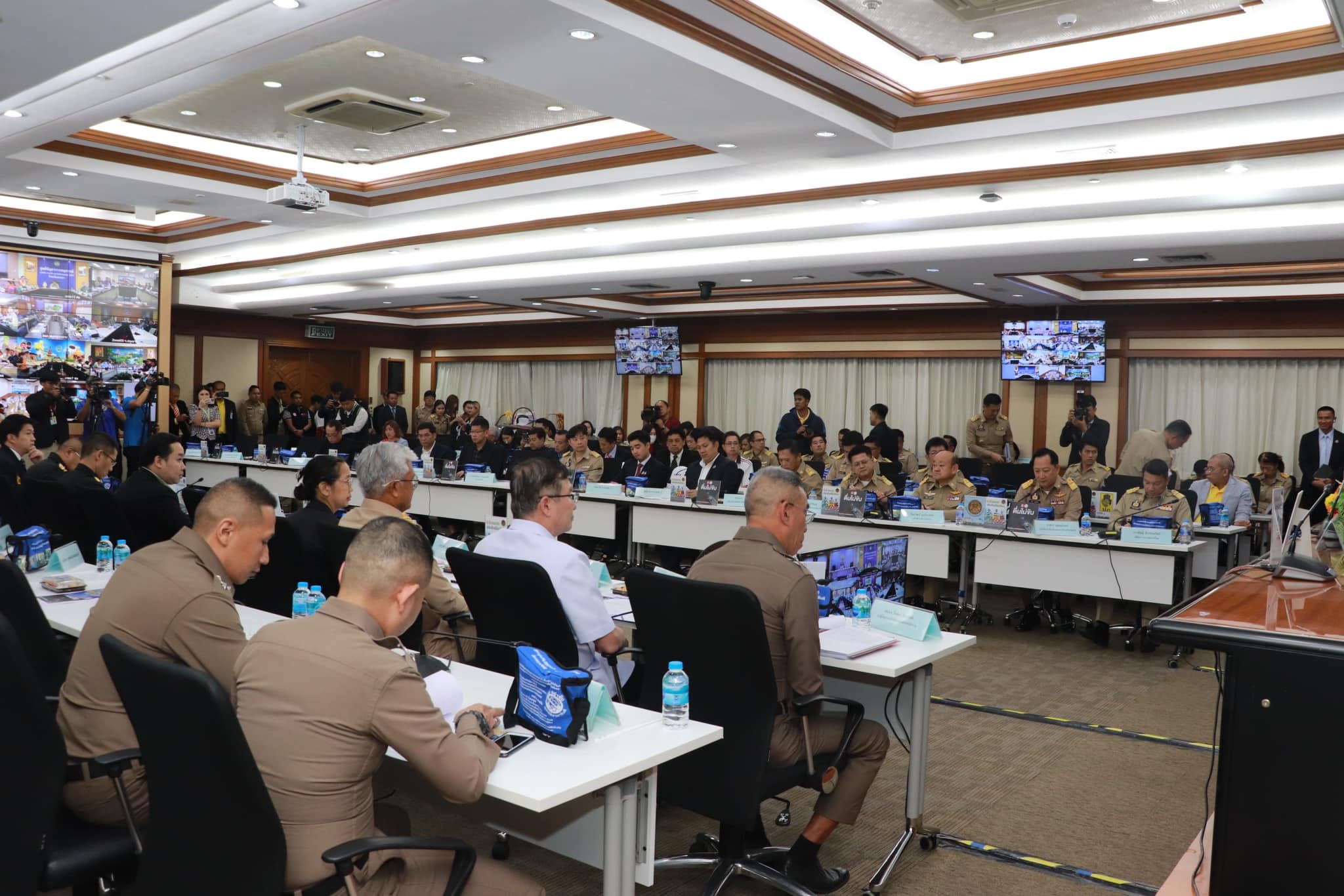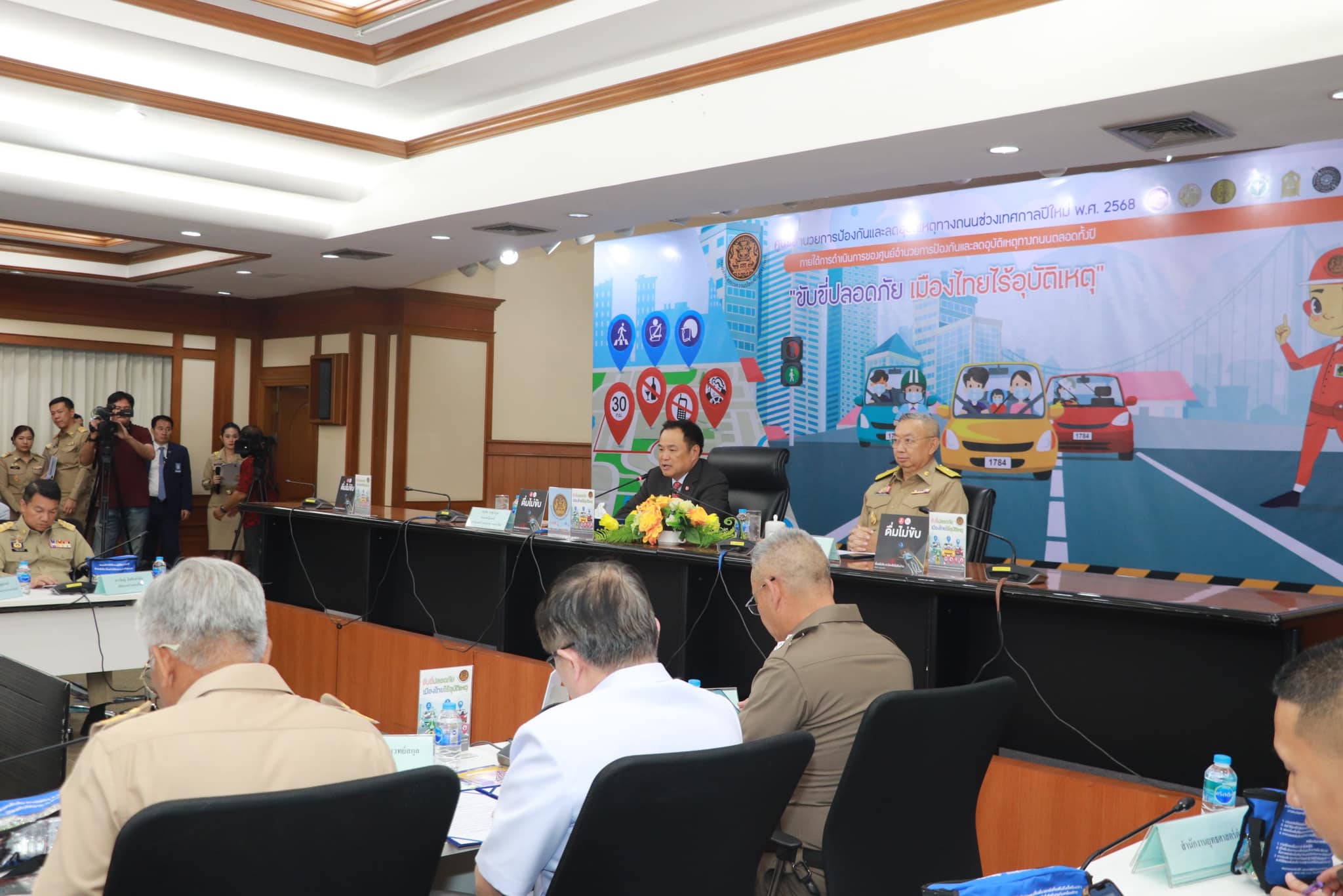 วันที่ 25 ธันวาคม 2567 เวลา 14.00 น. ที่ห้องประชุม 1 ปภ. กรมป้องกันและบรรเทาสาธารณภัย นายอนุทิน ชาญวีรกูล รองนายกรัฐมนตรี และรัฐมนตรีว่าการกระทรวงมหาดไทย เป็นประธานพิธีเปิดศูนย์อำนวยการป้องกันและลดอุบัติเหตุทางถนนช่วงเทศกาลปีใหม่ พ.ศ. 2568 โดยมี พล.ต.อ.เพิ่มพูน ชิดชอบ รัฐมนตรีว่าการกระทรวงศึกษาธิการ นายอรรษิษฐ์ สัมพันธรัตน์ ปลัดกระทรวงมหาดไทย นายสุเทพ แก่งสันเทียะ ปลัดกระทรวงศึกษาธิการ นายภาสกร บุญญลักษม์ อธิบดีกรมป้องกันและบรรเทาสาธารณภัย นายแพทย์ภาณุมาศ ญาณเวทย์สกุล อธิบดีกรมควบคุมโรค นายไชยวัฒน์ จุนถิระพงศ์ อธิบดีกรมการปกครอง นายนฤชา โฆษาศิวิไลซ์ อธิบดีกรมส่งเสริมการปกครองท้องถิ่น นายพงษ์นรา เย็นยิ่ง อธิบดีกรมโยธาธิการและผังเมือง ผู้แทนสำนักงานตำรวจแห่งชาติ ผู้แทนกรมคุมประพฤติ ผู้แทนกระทรวงคมนาคม พร้อมผู้แทนหน่วยงานภาคีเครือข่ายที่เกี่ยวข้อง ผู้บริหาร ปภ. เข้าร่วมประชุมฯ และประชุมผ่านสื่ออิเล็กทรอนิกส์ไปยังผู้ว่าราชการจังหวัดทุกจังหวัด มุ่งเน้นการบูรณาการขับเคลื่อนมาตรการป้องกันและลดอุบัติเหตุทางถนน ภายใต้แนวคิด “ขับขี่ปลอดภัย เมืองไทยไร้อุบัติเหตุ” รวมถึงเตรียมพร้อมอำนวยความสะดวกในการเดินทางและดูแลความปลอดภัยให้กับประชาชน เพื่อสร้างการสัญจรที่ปลอดภัยห่างไกลอุบัติเหตุ