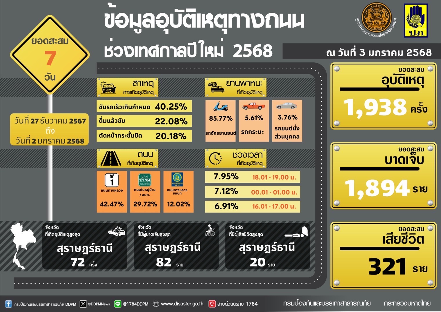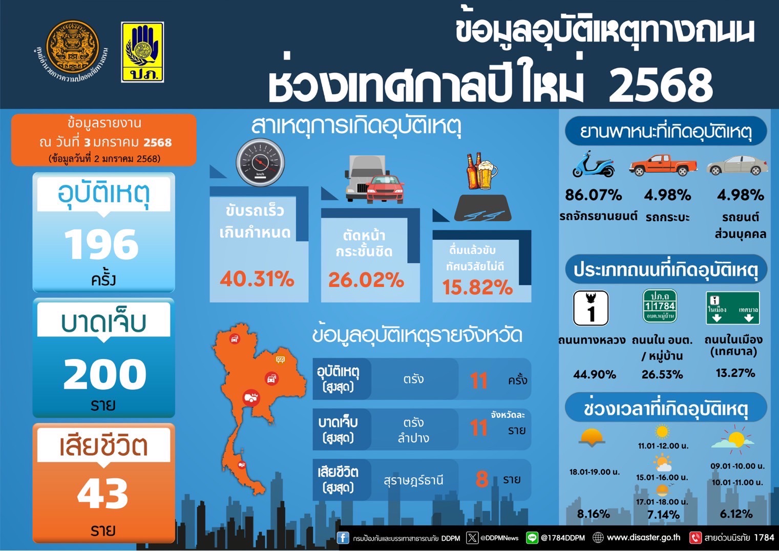 สำหรับข้อมูลอุบัติเหตุทางถนนช่วงเทศกาลปีใหม่ 2568 ประจำวันที่ 2 มกราคม 2568 ซึ่งเป็นวันที่เจ็ดของการรณรงค์ “ขับขี่ปลอดภัย เมืองไทยไร้อุบัติเหตุ” ศูนย์อำนวยการป้องกันและลดอุบัติเหตุทางถนนช่วงเทศกาลปีใหม่ พ.ศ. 2568 โดยกรมป้องกันและบรรเทาสาธารณภัยและความร่วมมือของหน่วยงานภาคีเครือข่ายได้รวบรวมสถิติอุบัติเหตุทางถนนประจำวันที่ 2 มกราคม 2568 เกิดอุบัติเหตุ 196 ครั้ง ผู้บาดเจ็บ 200 คน ผู้เสียชีวิต 43 ราย สาเหตุที่ทำให้เกิดอุบัติเหตุสูงสุด ได้แก่ ขับรถเร็ว ร้อยละ 40.31 ตัดหน้ากระชั้นชิด ร้อยละ 26.02 ดื่มแล้วขับและทัศนวิสัยไม่ดี ร้อยละ 15.82 ยานพาหนะที่เกิดอุบัติเหตุสูงสุด ได้แก่ รถจักรยานยนต์ ร้อยละ 86.07 ส่วนใหญ่เกิดบนเส้นทางตรง ร้อยละ 83.67 ถนนกรมทางหลวง ร้อยละ 44.9 ถนนใน อบต./หมู่บ้าน ร้อยละ 26.53 ช่วงเวลาที่เกิดอุบัติเหตุสูงสุด ได้แก่ เวลา 08.01-19.00 น. ร้อยละ 8.16 เวลา 11.01-12.00 น. เวลา 15.01-16.00 น. และ เวลา 17.01-18.00 น. ร้อยละ 7.14 เวลา 09.01-10.00 น. และเวลา 10.01-11.00 น. ร้อยละ 6.12 ผู้บาดเจ็บและเสียชีวิตสูงสุดอยู่ในช่วงอายุ 30-39 ปี ร้อยละ 17.7 จัดตั้งจุดตรวจหลัก 1,783 จุด เจ้าหน้าที่ปฏิบัติงาน 50,516 คน โดยจังหวัดที่เกิดอุบัติเหตุสูงสุด ได้แก่ ตรัง (11 ครั้ง) จังหวัดที่มีผู้บาดเจ็บสูงสุด ได้แก่ ตรังและลำปาง (จังหวัดละ 11 คน) จังหวัดที่มีผู้เสียชีวิตสูงสุด ได้แก่ สุราษฎร์ธานี (8 ราย)