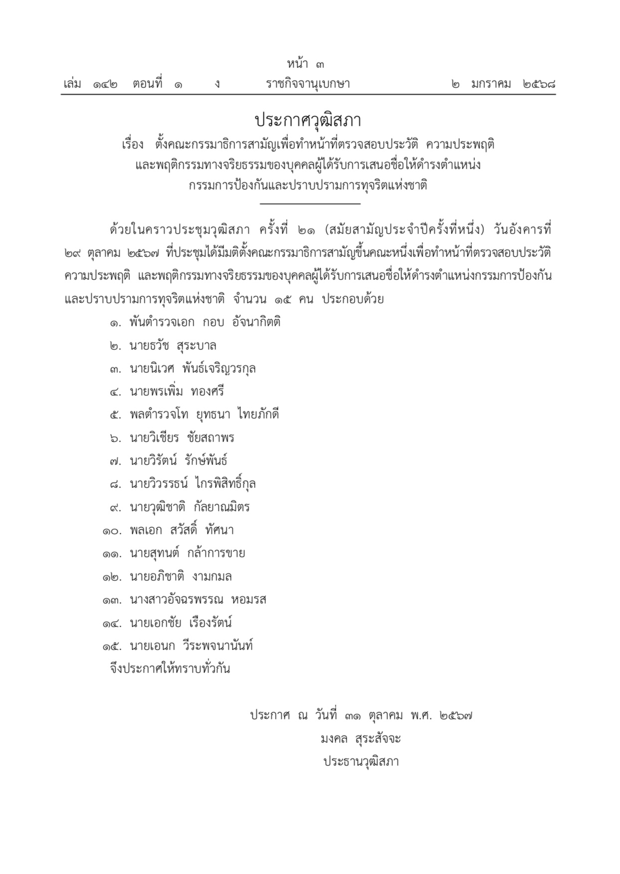 วันที่ 2 มกราคม 2568 เว็บไซต์ ราชกิจจานุเบกษา เผยแพร่ประกาศวุฒิสภา เรื่อง ตั้งคณะกรรมาธิการสามัญเพื่อทำหน้าที่ตรวจสอบประวัติ ความประพฤติ และพฤติกรรมทางจริยธรรมของบุคคลผู้ได้รับการเสนอชื่อให้ดำรงตำแหน่งกรรมการป้องกันและปราบปรามการทุจริตแห่งชาติ (นายประภาศ คงเอียด)